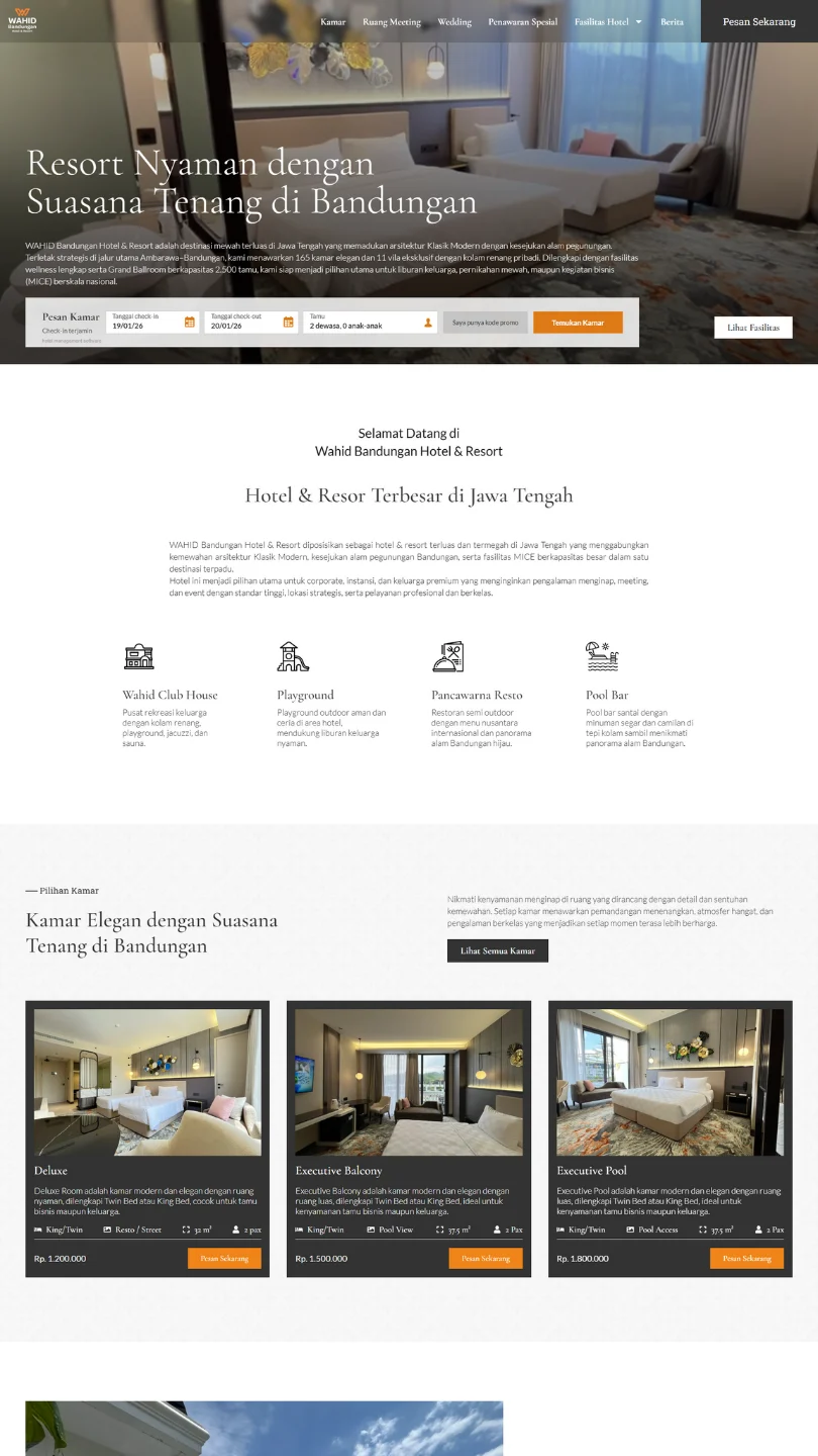 Hotel & resort terbesar di kawasan Bandungan. Setelah sukses di Salatiga, klien mempercayakan kami kembali untuk mengembangkan website hotel dan resort ini—fokus pada visual, informasi yang jelas, dan kemudahan calon tamu mengambil keputusan.